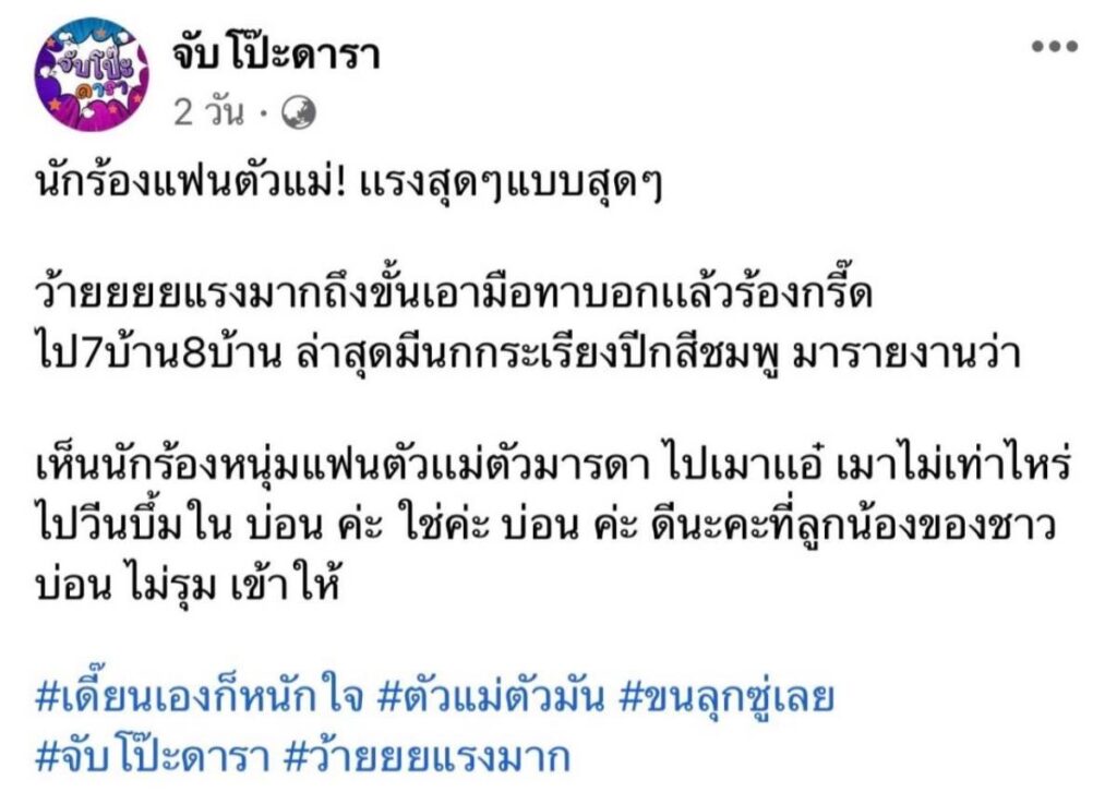 มีการบ้านมาให้นักเรียนสายโซเชียลทำงานบ้านอีกแล้ว ถึงอักษรย่อ ว่าจะสอบผ่านกันไหมนะ หลังมีเพจดังออกมาแฉว่า “นักร้องแฟนตัวแม่! เเรงสุด ๆ แบบสุด ๆ ว้ายยยยแรงมากถึงขั้นเอามือทาบอกเเล้วร้องกรี๊ดไป7บ้าน8บ้าน ล่าสุดมีนกกระเรียงปีกสีชมพู มารายงานว่าเห็นนักร้องหนุ่มแฟนตัวเเม่ตัวมารดา ไปเมาเเอ๋ เมาไม่เท่าไหร่ ไปวีนบึ้มใน บ่อน ค่ะ ใช่ค่ะ บ่อน ค่ะ ดีนะคะที่ลูกน้องของชาวบ่อน ไม่รุม เข้าให้ #เดี๊ยนเองก็หนักใจ #ตัวแม่ตัวมัน #ขนลุกซู่เลย#จับโป๊ะดารา #ว้ายยยแรงมาก” ท่ามกลางคอมเมนต์สนั่นถึงอักษรย่อก-ฮ กันเลยทีเดียว แต่ที่ทำเอาสะดุดก็มีชื่อของนักร้องฮิปฮอป”โต้ง ทูพี”กับแฟนสาว”พลอย เฌอมาลย์” ติดชื่อมาด้วย อาจจะด้วยไลฟ์สไลต์ที่ทั้งคู่เป็นคนชอบเที่ยวชอบสนุกสนาน