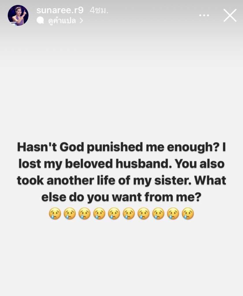 นอกจากนั้น “สุนารี” ยังได้โพสต์ข้อความลงไอจีสตอรี่ ตัดพ้อว่า “Hasn’t God punished me enough? I lost my beloved husband. You also took another life of my sister. What else do you want from me?”