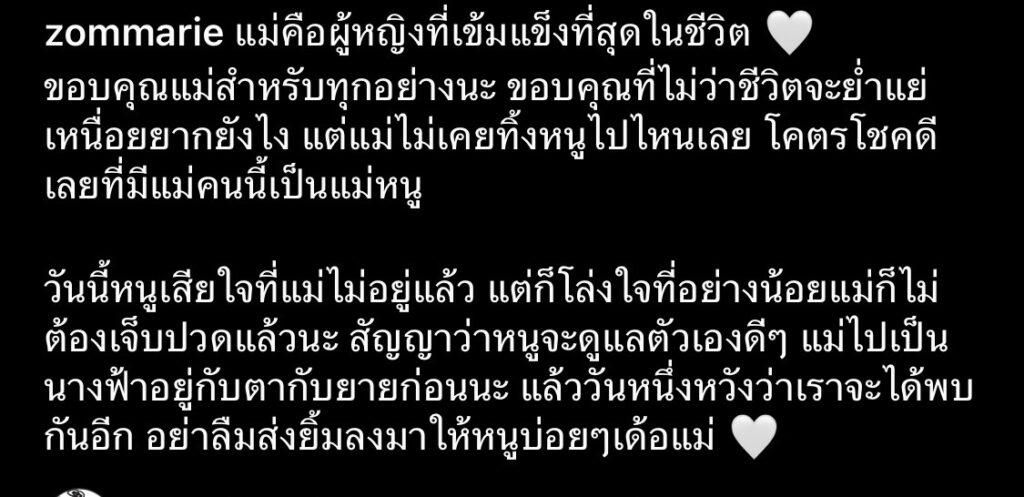 วันนี้หนูเสียใจที่แม่ไม่อยู่แล้ว แต่ก็โล่งใจที่อย่างน้อยแม่ก็ไม่ต้องเจ็บปวดแล้วนะ สัญญาว่าหนูจะดูแลตัวเองดีๆ แม่ไปเป็นนางฟ้าอยู่กับตากับยายก่อนนะ แล้ววันหนึ่งหวังว่าเราจะได้พบกันอีก อย่าลืมส่งยิ้มลงมาให้หนูบ่อยๆเด้อแม่ 🤍