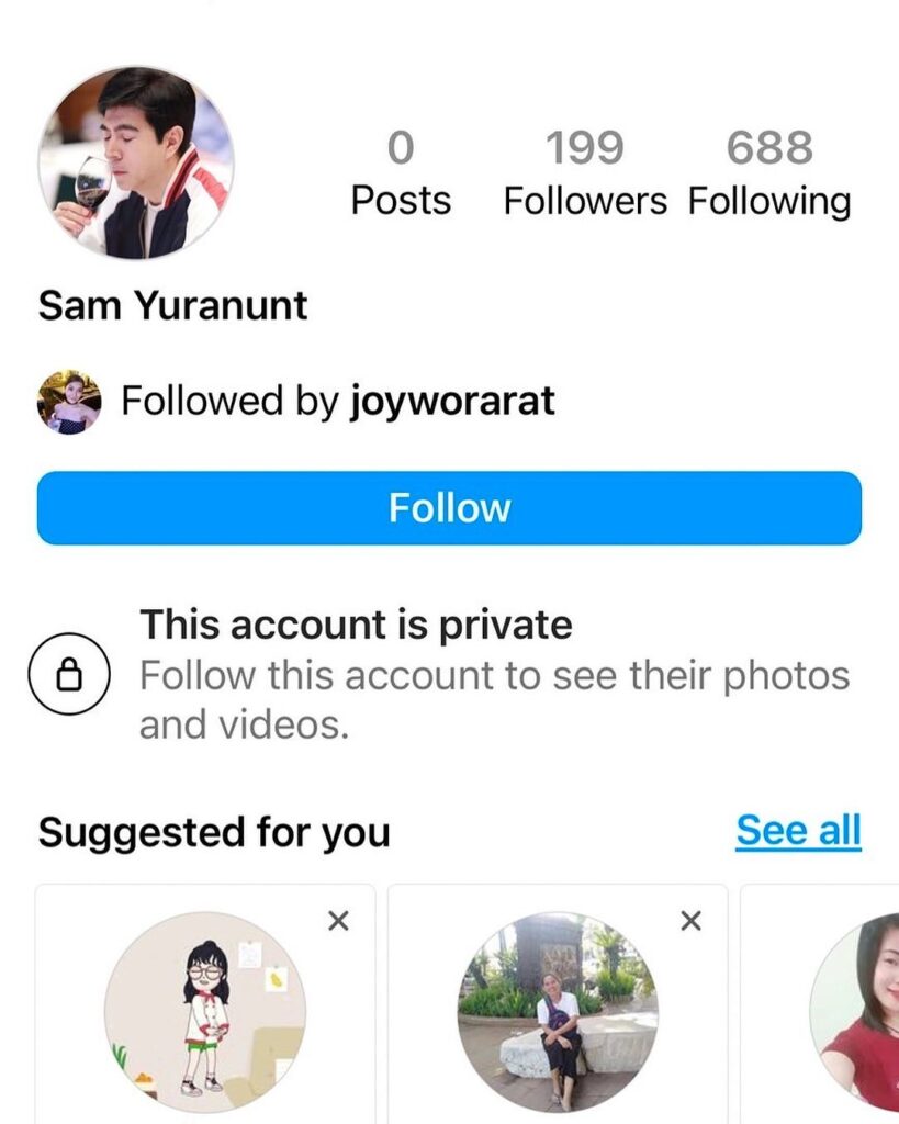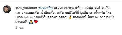 โดย แซม ยุรนันท์ ได้โพสต์ภาพแอคเคาท์ปลอมพร้อมระบุแคปชั่นว่า “#มิจฉาชีพ นะครับ อย่าหลงเชื่อ!!! เห็นถามเข้ามากันหลายคนเลยครับ ..ย้ำอีกครั้งนะครับ ผมมีไอจีนี้ ig เดียว เท่านั้นครับ ใครเผลอ follow ไปแล้วรีบออกมาเลยครับ ขอบคุณที่เป็นห่วงและถามเข้ามานะครับ”