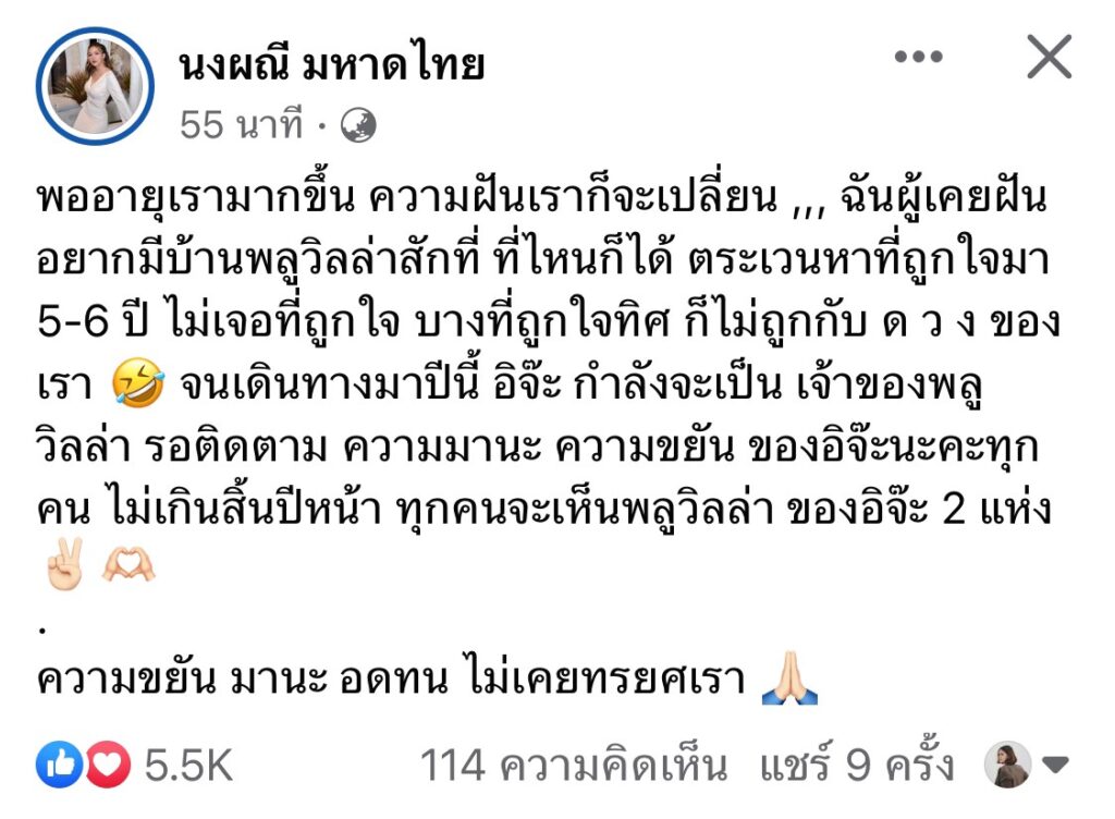 “พออายุเรามากขึ้น ความฝันเราก็จะเปลี่ยน ,,, ฉันผู้เคยฝันอยากมีบ้านพลูวิลล่าสักที่ ที่ไหนก็ได้ ตระเวนหาที่ถูกใจมา 5-6 ปี ไม่เจอที่ถูกใจ บางที่ถูกใจทิศ ก็ไม่ถูกกับ ด ว ง ของเรา