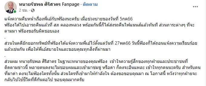 ฟร้องได้ไปเอารถคืนแล้วที่ สภ. คลองหลวง พร้อมกันนี้ก็ได้ส่งรถคืนไฟแนนซ์แล้วทันที ส่วนภาระต่างๆ ที่จะตามมา ฟร้องขอรับผิดชอบเอง