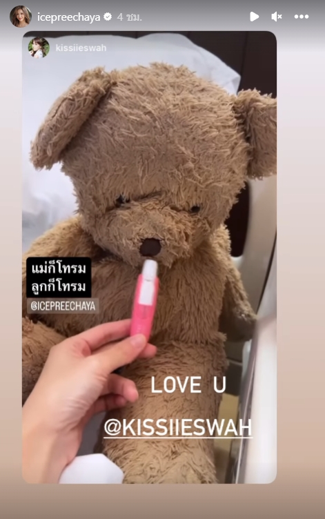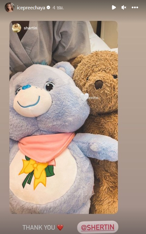 ล่าสุด “ไอซ์” ได้ออกมาเคลื่อนไหวอีกครั้ง ผ่านอินสตาแกรมสตอรี่ส่วนตัว โดยเธอได้ทำการรีโพสต์สตอรี่จากเพื่อนที่เดินทางมาเยี่ยม โดยเป็นภาพน้องหมี 2 ตัว กับข้อความ “Thank You” และคลิปเอายาดมให้น้องหมี เขียนกำกับไว้ว่า “แม่ก็โทรม ลูกก็โทรม” ท่ามกลางคนบันเทิงและแฟนคลับเข้ามาแสดงความเป็นห่วงและให้กำลังใจอย่างล้นหลาม