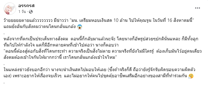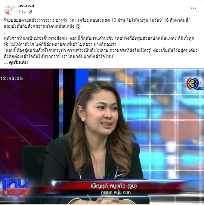 เพจดังแฉ สาวคนสนิท “หนุ่ม กะลา” เตรียมหอบเงินสด 10 ล้าน ให้ “จูน เพ็ญชุลี” 16 สค.นี้