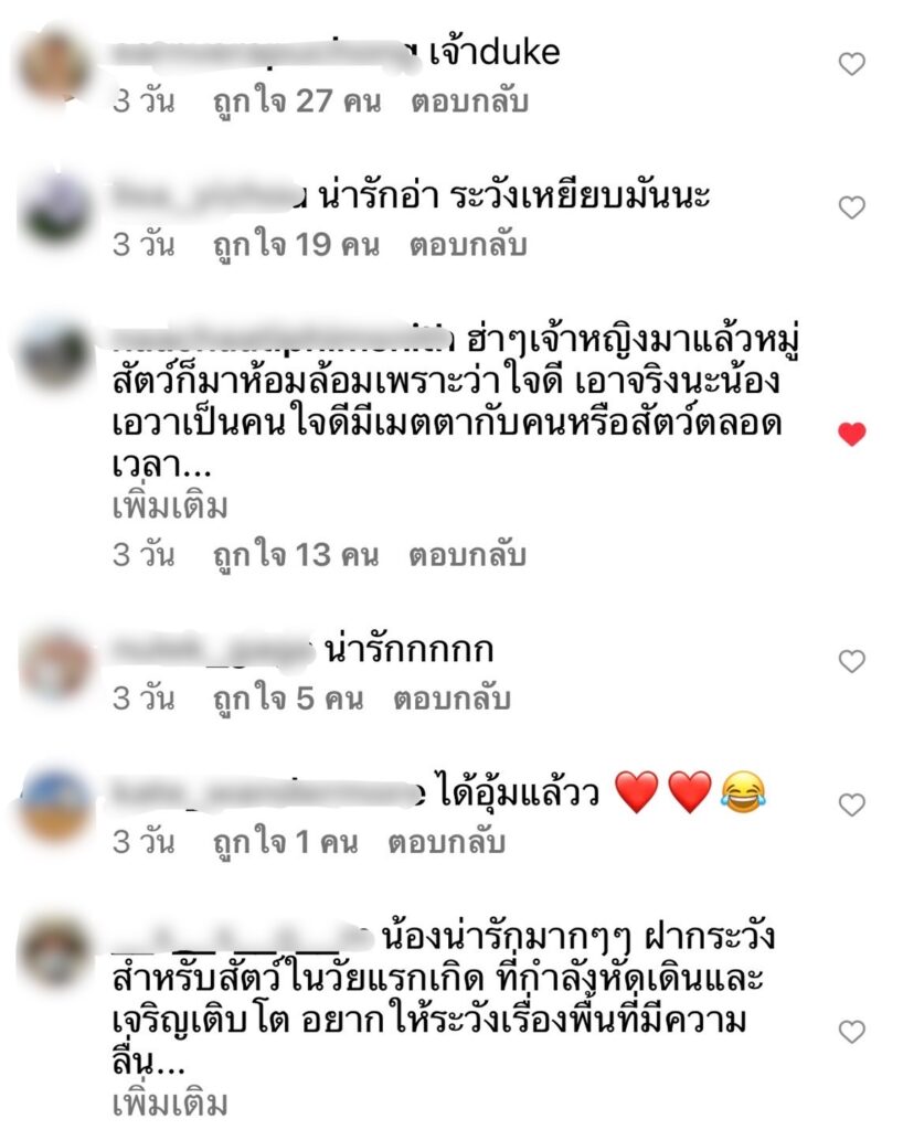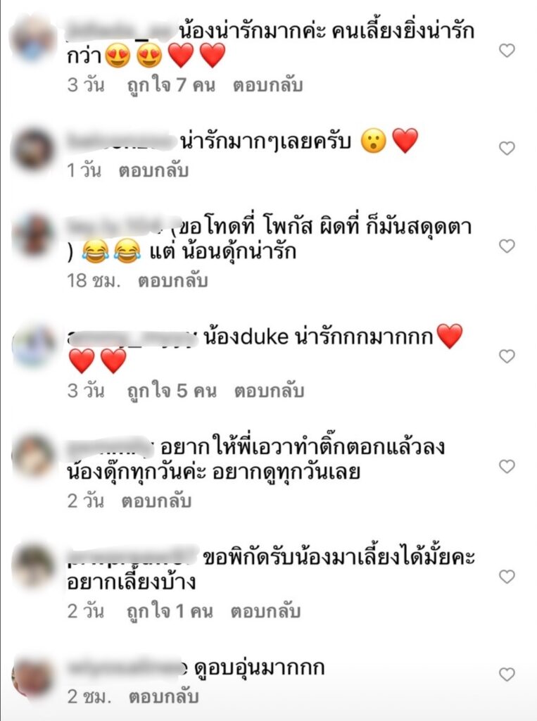ซึ่งหลังจาก “เอวา” ได้โพสต์คลิปความน่ารักของ “น้อง Duke” ลงไปแฟนๆ ก็เข้ามาคอมเมนต์ชมความน่ารักของน้องเป็นจำนวนมาก อาทิ น้องน่ารักมากค่ะ คนเลี้ยงยิ่งน่ารักกว่า, อยากให้พี่เอวาทำติ๊กตอกแล้วลงน้องดุ๊กทุกวันค่ะ อยากดูทุกวันเลย, น้องduke น่ารักกกมากกก, ระวังเหยียบน้องน้า ฯลฯ