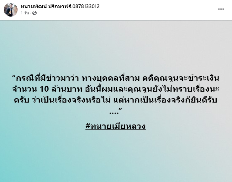 “กรณีที่มีข่าวมาว่า ทางบุคคลที่สาม คดีคุณจูนจะชำระเงินจำนวน 10 ล้านบาท อันนี้ผมและคุณจูนยังไม่ทราบเรื่องนะครับ ว่าเป็นเรื่องจริงหรือไม่ แต่หากเป็นเรื่องจริงก็ยินดีรับ …. #ทนายเมียหลวง”