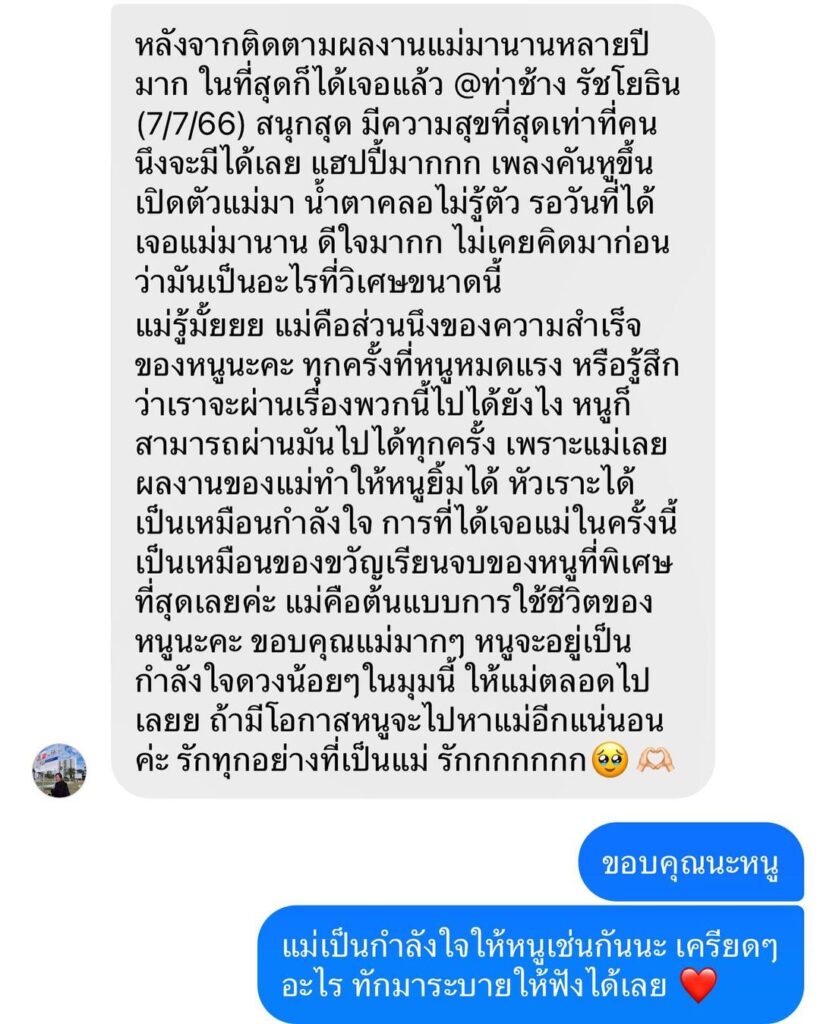 แม่รู้มั้ยยย แม่คือส่วนนึงของความสำเร็จของหนูนะคะ ทุกครั้งที่หนูหมดแรง หรือรู้สึกว่าเราจะผ่านเรื่องพวกนี้ไปได้ยังไง หนูก็สามารถผ่านมันไปได้ทุกครั้ง เพราะแม่เลยผลงานของแม่ทำให้หนูยิ้มได้ หัวเราะได้เป็นเหมือนกำลังใจ การที่ได้เจอแม่ในครั้งนี้เป็นเหมือนของขวัญเรียนจบของหนูที่พิเศษที่สุดเลยค่ะ
