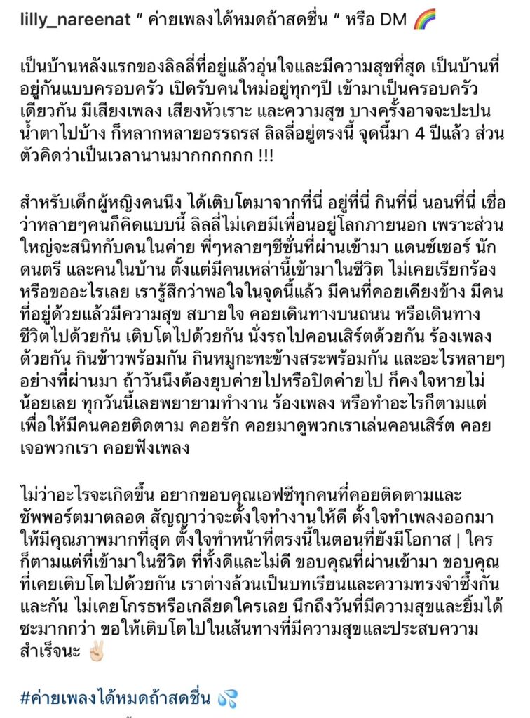 สำหรับเด็กผู้หญิงคนหนึ่งได้เติบโตมาจากที่นี่ อยู่ที่นี่ กินที่นี่ นอนที่นี่ เชื่อว่าหลายๆ คนก็คิดแบบนี้ ลิลลี่ ไม่เคยมีเพื่อนอยู่โลกภายนอก เพราะส่วนใหญ่จะสนิทกับคนในค่าย พี่ๆ หลายๆ ซีซั่นที่ผ่านเข้ามา แดนซ์เซอร์ นักดนตรี และคนในบ้าน ตั้งแต่มีคนเหล่านี้เข้ามาในชีวิต ไม่เคยเรียกร้องหรือขออะไรเลย เรารู้สึกว่าพอใจในจุดนี้แล้ว มีคนที่คอยเคียงข้าง มีคนที่อยู่ด้วยแล้วมีความสุข สบายใจ คอยเดินทางบนถนน หรือเดินทางชีวิตไปด้วยกัน เติบโตไปด้วยกัน นั่งรถไปคอนเสิร์ตด้วยกัน ร้องเพลงด้วยกัน กินข้าวพร้อมกัน กินหมูกะทะข้างสระพร้อมกัน และอะไรหลายๆอย่างที่ผ่านมา ถ้าวันนึงต้องยุบค่ายไปหรือปิดค่ายไป ก็คงใจหายไม่น้อยเลย ทุกวันนี้เลยพยายามทำงาน ร้องเพลง หรือทำอะไรก็ตามแต่ เพื่อให้มีคนคอยติดตาม คอยรัก คอยมาดูพวกเราเล่นคอนเสิร์ต คอยเจอพวกเรา คอยฟังเพลง
