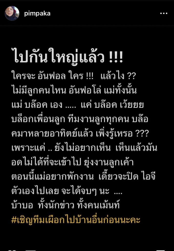 “ไปกันใหญ่แล้ว !!! ใครจะ อันฟอล ใคร !!! แล้วไง ?? ไม่มีลูกคนไหน อันฟอโล่ แม่ทั้งนั้น แม่ บล๊อค เอง ….. แค่ บล๊อค เว้ยยย บล็อกเพื่อนลูก ทีมงานลูกทุกคน บล๊อคมาหลายอาทิตย์แล้ว เพิ่งรู้เหรอ ???