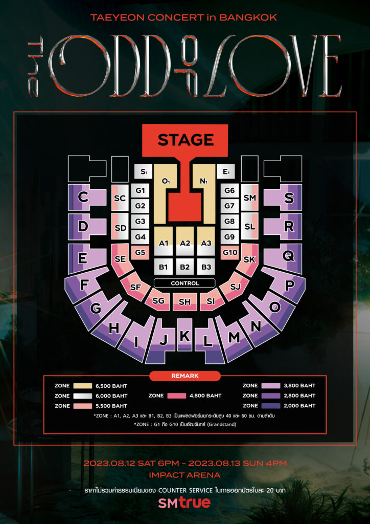 เปิดจำหน่ายบัตรคอนเสิร์ตก่อนใคร สำหรับสมาชิก SM True MEMBERSHIP ในวันเสาร์ที่ 15 กรกฎาคม 2566 เวลา 11.00 น. – 12.00 น. เท่านั้น และสำหรับบุคคลทั่วไป ในวันอาทิตย์ที่ 16 กรกฎาคม 2566 เวลา 11.00 น. เป็นต้นไป ทางเคาน์เตอร์เซอร์วิสใน 7- Eleven หรือร้านค้าที่มีสัญลักษณ์เคาน์เตอร์เซอร์วิสทุกสาขาทั่วประเทศ และทางเว็บไซต์ allticket.com/event/TAEYEON_TheODDOfLOVE_in_BKK ราคา (บัตรนั่งทั้งหมด) : 6,500 / 6,000 / 5,500 / 4,800 / 3,800 / 2,800 / 2,000 บาท สอบถามข้อมูลเพิ่มเติมได้ที่ Counter Service Call Center 02-826-7788 หรือติดตามข่าวสารของคอนเสิร์ตทางบัญชีโซเชียล มีเดียต่าง ๆ ของ SM True : เฟซบุ๊ก facebook.com/smtruethailand, อินสตาแกรม instagram.com/smtruethailand และทวิตเตอร์ twitter.com/SMTrueThailand