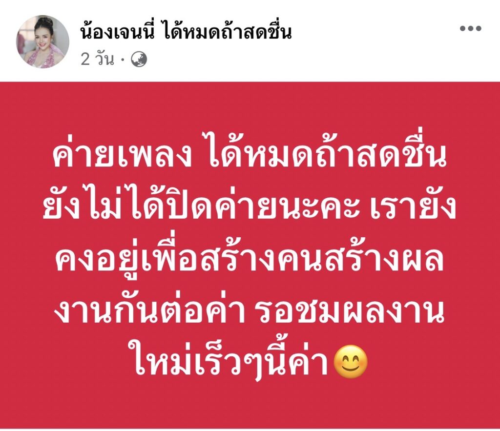 “ค่ายเพลง ได้หมดถ้าสดชื่น ยังไม่ได้ปิดค่ายนะคะ เรายังคงอยู่เพื่อสร้างคนสร้างผลงานกันต่อค่า รอชมผลงานใหม่เร็วๆนี้ค่า😊”