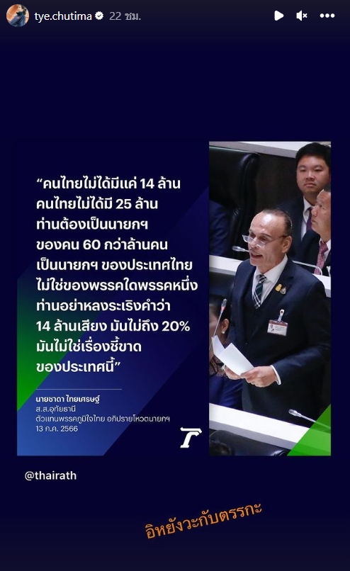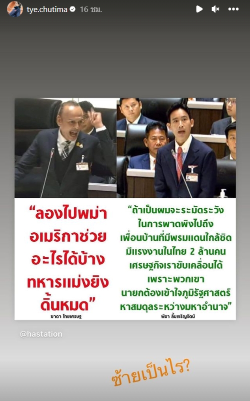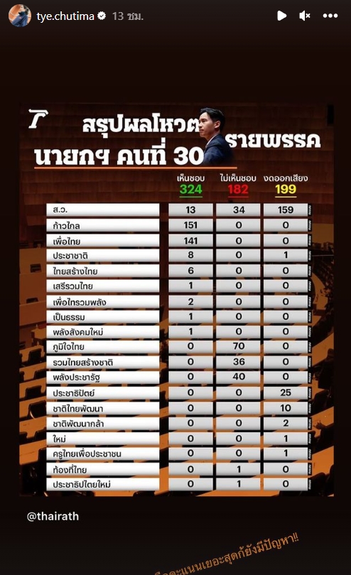 ล่าสุด “ต่าย ชุติมา” อดีตภรรยาของ “ทิม พิธา” หลังรับทราบผลโหวต ก็ได้ออกมาเคลื่อนไหวผ่านอินสตาแกรมโดยได้แคปภาพเป็นโค้ดคำพูดของ นายชาดา ไทยเศรษฐ์ ส.ส.พรรคภูมิใจไทย ที่ได้อภิปรายอย่างดุเดือด ลงไอจีสตอรี่ พร้อมกับแคปชั่นว่า “อิหยังวะกับตรรรกะนี้”
