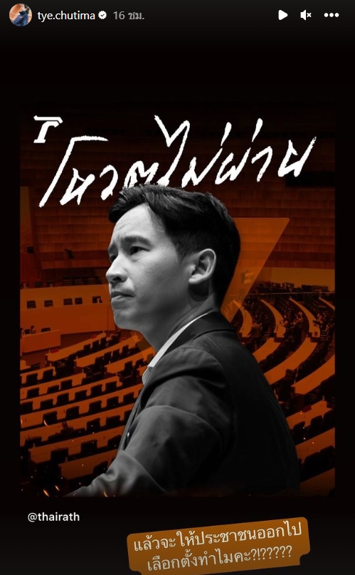 นอกจากนี้เจ้าตัวยังได้แสดงความคิดเห็นไว้ผ่านไอจีสตอรี่ว่า “แล้วจะให้ประชาชนออกไปเลือกตั้งทำไมคะ” ท่ามกลางแฟนๆที่เข้ามาร่วมแสดงความคิดเห็นและให้กำลังใจอย่างล้นหลาม