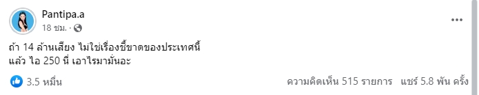ล่าสุดเจ้าตัว ได้ออกมาโพสต์ฟาดเดือดผ่านเฟซบุ๊กส่วนตัวว่า “ถ้า 14 ล้านเสียง ไม่ใช่เรื่องชี้ขาดของประเทศนี้ แล้ว ไอ 250 นี่ เอาไรมามั่นอะ”