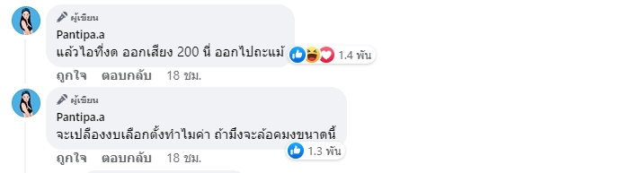 นอกจากนี้ ปุ้มปุ้ย ยังได้แสดงความคิดเห็นลงใต้คอมเมนต์อีกว่า “แล้วไอที่งด ออกเสียง 200 นี่ ออกไปถะแม้”, “จะเปลืองงบเลือกตั้งทำไมค่า ถ้ามึงจะล็อกมงขนาดนี้” งานนี้ได้ใจกองเชียร์ด้อมส้มมาก ต่างเข้ามากดไลก์ให้อย่างท่วมท้นเลยทีเดียว