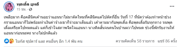 และในเวลาต่อมา แอนนา ได้โพสต์ข้อความว่า “งดติดต่องานผ่านพุดเดิ้ลก่อนนะคะช่วงนี้ ติดต่อทุกอย่างทักเพจค่ะ พุดเดิ้ลนางรับไม่ไหวแล้ว”