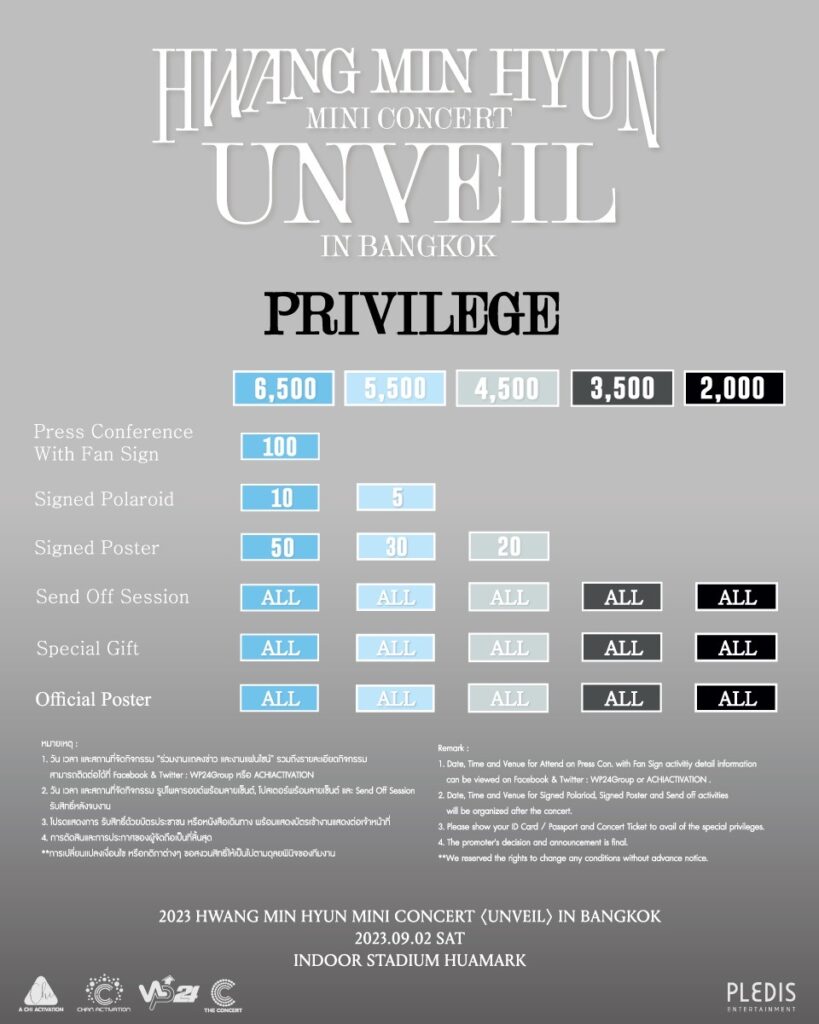 เสน่ห์เกินต้านและความสามารถรอบด้านของ ฮวัง มินฮยอน รอคอยให้ทุกคนได้พิสูจน์ด้วยสายตาตัวเอง ใน “2023 ฮวัง มินฮยอน โซโล่ มินิ–คอนเสิร์ต <อันเวล> อิน ไทยแลนด์” (2023 HWANG MIN HYUN MINI CONCERT <UNVEIL> IN BANGKOK) วันเสาร์ที่ 2 กันยายนนี้ ณ อินดอร์ สเตเดียม หัวหมาก ออกสตาร์ทจองบัตรวันแรก วันอาทิตย์ที่ 23 กรกฎาคม 2566 นี้ ตั้งแต่เวลา 12.00 น. เป็นต้นไป ทาง www.theconcert.com บัตรราคา 6,500 / 5,500 / 4,500 / 3,500 และ 2,000 บาท สอบถามและติดตามข้อมูลเพิ่มเติมได้ทาง Facebook, Instagram, Tiktok และTwitter “WP24GROUP” หรือ Facebook:ACHIACTIVATION, Twitter @achiactivation, Instagram : ACHI_ACTIVATION และ Line @achiactivation