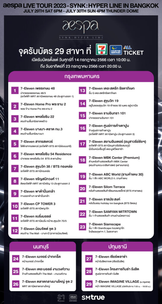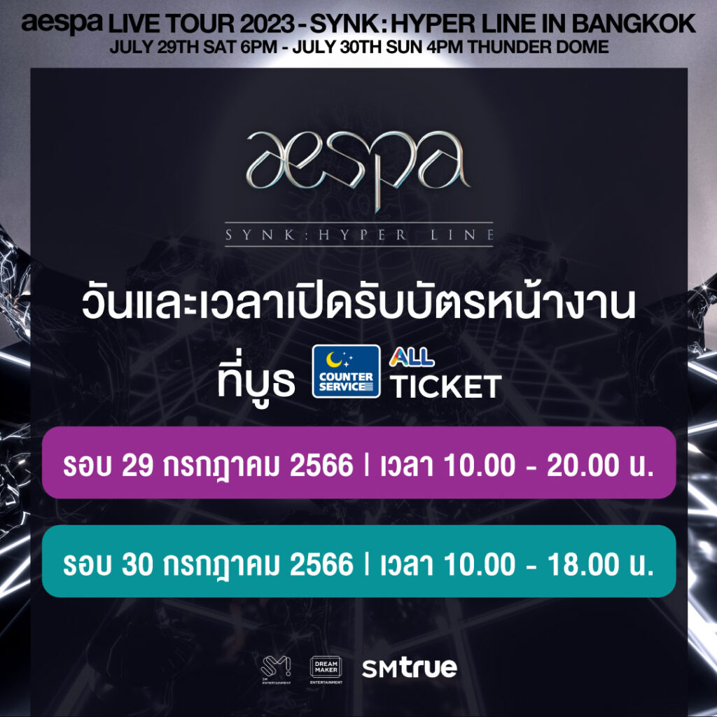 สำหรับท่านใดที่ซื้อบัตรได้สำเร็จเรียบร้อยแล้ว ทั้งในรอบ SM True MEMBERSHIP และรอบบุคคลทั่วไป สามารถแลกรับบัตรการแสดง (บัตรพลาสติกสำหรับใช้เป็นหลักฐานในการเข้าชม) ได้ที่ 7-Eleven ทั้ง 29 สาขา ตั้งแต่วันศุกร์ที่ 14 กรกฎาคม 2566 เวลา 10.00 น. เป็นต้นไป จนถึงวันอาทิตย์ที่ 23 กรกฎาคม 2566 เวลา 20.00 น. หรือรับบัตรการแสดงที่หน้างานคอนเสิร์ต (รายละเอียดเพิ่มเติม bit.ly/TicketPickUp_aespa_SYNK_HYPERLINEinBKK) ติดตามข่าวสารเกี่ยวกับคอนเสิร์ตได้ทางบัญชีโซเชียล มีเดียต่าง ๆ ของ SM True : เฟซบุ๊ก facebook.com/smtruethailandอินสตาแกรม instagram.com/smtruethailand และทวิตเตอร์ twitter.com/SMTrueThailand