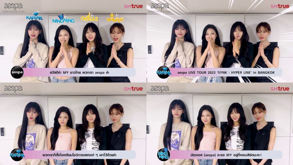 ❝ สวัสดีค่ะ MY ชาวไทย พวกเรา aespa ค่ะ แฟน ๆ ชาวไทยคะ ในที่สุดพวกเราก็จะได้ไปพบทุกคน พร้อมกับคอนเสิร์ตเดี่ยวครั้งแรกของเรา aespa LIVE TOUR 2023 ‘SYNK : HYPER LINE’ in BANGKOK โดยคอนเสิร์ตครั้งนี้จะจัดขึ้นในวันเสาร์ที่ 29 กรกฎาคม 2566 (18.00 น.) และวันอาทิตย์ที่ 30 กรกฎาคม 2566 (16.00 น.) ที่ธันเดอร์โดมค่ะ และให้สมกับการรอคอยของทุกคน พวกเราก็ตั้งใจเตรียมโชว์การแสดงเท่ ๆ เอาไว้ด้วยค่ะ เพราะฉะนั้น ทุกคนต้องมาสนุกกับพวกเราที่คอนเสิร์ตนะคะ น้องเอส (aespaจะรอ MY อยู่ที่คอนเสิร์ตนะคะ ! ขอบคุณค่ะ
