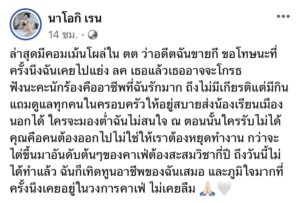 ณ ตอนนั้นใครรับไม่ได้คุณคือคนต้องออกไปไม่ใช่ให้เราต้องหยุดทำงาน กว่าจะไต่ขึ้นมาอันดับต้นๆ ของคาเฟ่ต้องสะสมวิชากี่ปี ถึงวันนี้ไม่ได้ทำแล้ว ฉันก็เทิดทูนอาชีพของฉันเสมอ และภูมิใจมากที่ครั้งนึงเคยอยู่ในวงการคาเฟ่ ไม่เคยลืม”