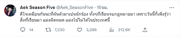 ‘ดีใจเหมือนกันนะที่ผันตัวมาเป็นนักร้อง ทั้งๆที่เรียนจบกฎหมายมา เพราะวันนี้ก็เพิ่งรู้ว่าสิ่งที่เรียนมา แ-่งผิดหมด แ-่งใช้ไม่ได้ในประเทศนี้’ ท่ามกลางชาวเน็ตที่เห็นด้วยเข้ามาแสดงความคิดเห็นเป็นจำนวนมาก