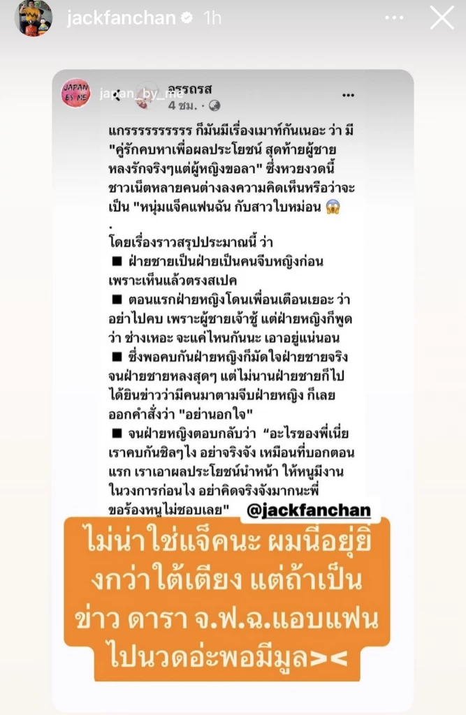 ยังเป็นประเด็นร้อนในโลกออนไลน์ที่หลายคนจับตามอง จากกรณีเพจข่าวดัง ได้เปิดข่าวเม้าท์เกี่ยวกับ คู่รักคบหากันเพื่อหวังผลประโยชน์ สุดท้ายผู้ชายหลงรักจริงๆ แต่ผู้หญิงขอลา ซึ่งหลายคนโยงไปที่คู่ของนักแสดงหนุ่มอารมณ์ดี “แจ็ค แฟนฉัน” และหวานใจสาว “ใบหม่อน กิตติยา” จนทั้งคู่ต้องออกมาชี้แจงปมดราม่าดังกล่าวไปแล้วนั้น