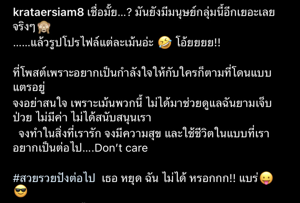 “เชื่อมั้ย? มันยังมีมนุษย์กลุ่มนี้อีกเยอะเลยจริงๆแล้วรูปโปรไฟล์แต่ละเม้นอ่ะ…โอ้ยยยย!! ที่โพสต์เพราะอยากเป็นกำลังใจให้กับใครก็ตามที่โดนแบบแตรอยู่ จงอย่าสนใจ เพราะม้นพวกนี้ ไม่ได้มาช่วยดูแลฉันยามเจ็บป่วย ไม่มีค่า ไม่ได้สนับสนุนเรา จงทำในสิ่งที่เรารัก จงมีความสุขและใช้ชีวิตในแบบที่เรา อยากเป็นต่อไป Don’t care