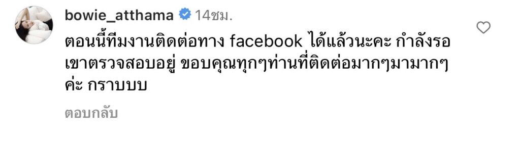 ซึ่งต่อมาเจ้าตัวก็แจ้งข่าวอีกครั้งโดยคอมเมนต์ว่า” ตอนนี้ทีมงานติดต่อทาง Facebook ได้แล้วนะคะ กำลังรอเขาตรวจสอบอยู่ ขอบคุณทุกๆท่านที่ติดต่อมากๆ มามากๆค่ะ กราบ” ท่ามกลางชาวเน็ต เข้ามาคอมเมนต์ส่งกำลังใจให้สาวโบวี่กู้เฟซบุ๊กคืนมาให้ได้โดยเร็ววัน