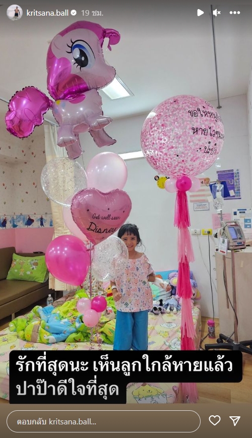 “ป้าพาไปเล่นของเล่นกลับบ้านมีไข้ น่าสงสาร ป้าไม่ได้ตั้งใจนะลูกรักลูกนะคับ” และต่อมาก็โพสต์ภาพลูกสาวยิ้มสดใสกับห้องในโรงพยาบาลที่มีลูกโปร่งเต็มไปหมดพร้อมข้อความว่า “รักที่สุดนะ เห็นลูกใกล้หายแล้ว ปาป้าดีใจที่สุด”