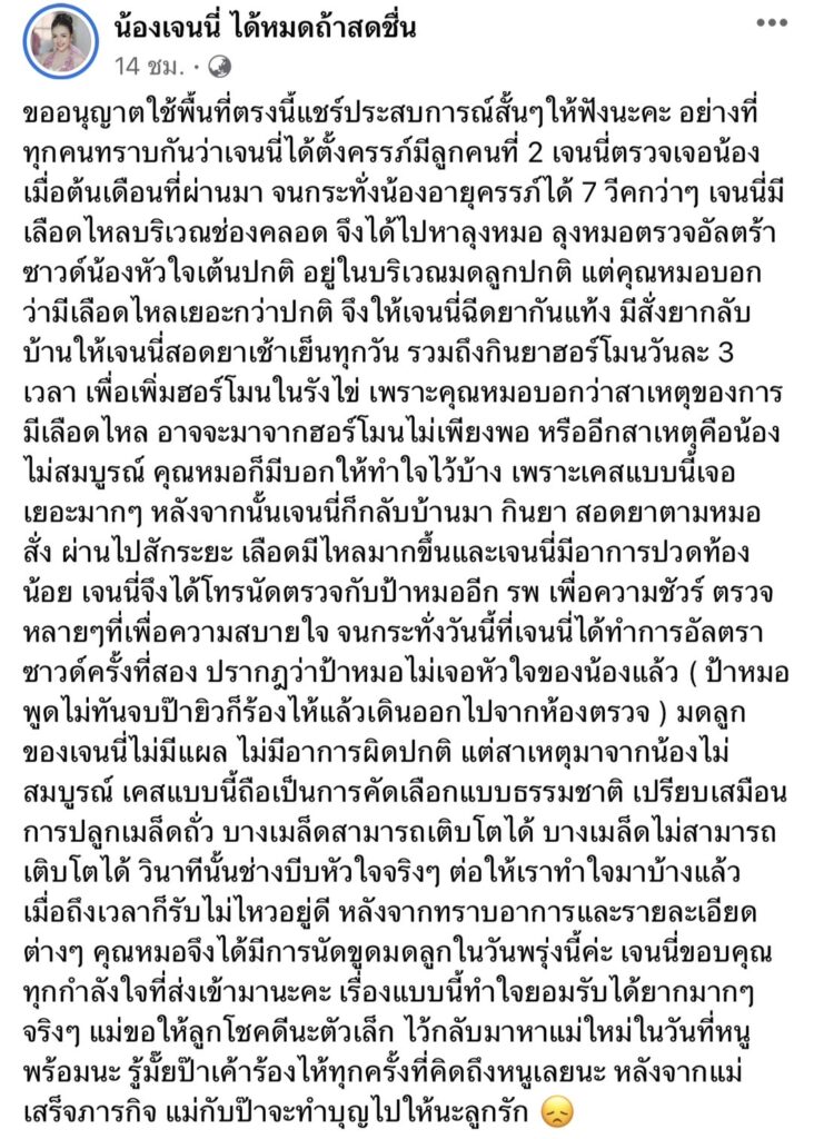 ขออนุญาตใช้พื้นที่ตรงนี้แชร์ประสบการณ์สั้นๆให้ฟังนะคะ อย่างที่ทุกคนทราบกันว่าเจนนี่ได้ตั้งครรภ์มีลูกคนที่ 2 เจนนี่ตรวจเจอน้องเมื่อต้นเดือนที่ผ่านมา จนกระทั่งน้องอายุครรภ์ได้ 7 วีคกว่าๆ เจนนี่มีเลือดไหลบริเวณช่องคลอด จึงได้ไปหาลุงหมอ ลุงหมอตรวจอัลตร้าซาวด์น้องหัวใจเต้นปกติ อยู่ในบริเวณมดลูกปกติ แต่คุณหมอบอกว่ามีเลือดไหลเยอะกว่าปกติ จึงให้เจนนี่ฉีดยากันแท้ง มีสั่งยากลับบ้านให้เจนนี่สอดยาเช้าเย็นทุกวัน รวมถึงกินยาฮอร์โมนวันละ 3 เวลา เพื่อเพิ่มฮอร์โมนในรังไข่ เพราะคุณหมอบอกว่าสาเหตุของการมีเลือดไหล อาจจะมาจากฮอร์โมนไม่เพียงพอ หรืออีกสาเหตุคือน้องไม่สมบูรณ์ คุณหมอก็มีบอกให้ทำใจไว้บ้าง เพราะเคสแบบนี้เจอเยอะมากๆ หลังจากนั้นเจนนี่ก็กลับบ้านมา กินยา สอดยาตามหมอสั่ง ผ่านไปสักระยะ เลือดมีไหลมากขึ้นและเจนนี่มีอาการปวดท้องน้อย เจนนี่จึงได้โทรนัดตรวจกับป้าหมออีก รพ เพื่อความชัวร์ ตรวจหลายๆที่เพื่อความสบายใจ จนกระทั่งวันนี้ที่เจนนี่ได้ทำการอัลตราซาวด์ครั้งที่สอง ปรากฎว่าป้าหมอไม่เจอหัวใจของน้องแล้ว ( ป้าหมอพูดไม่ทันจบป๊ายิวก็ร้องไห้แล้วเดินออกไปจากห้องตรวจ ) มดลูกของเจนนี่ไม่มีแผล ไม่มีอาการผิดปกติ แต่สาเหตุมาจากน้องไม่สมบูรณ์ เคสแบบนี้ถือเป็นการคัดเลือกแบบธรรมชาติ เปรียบเสมือนการปลูกเมล็ดถั่ว บางเมล็ดสามารถเติบโตได้ บางเมล็ดไม่สามารถเติบโตได้ วินาทีนั้นช่างบีบหัวใจจริงๆ ต่อให้เราทำใจมาบ้างแล้ว เมื่อถึงเวลาก็รับไม่ไหวอยู่ดี หลังจากทราบอาการและรายละเอียดต่างๆ คุณหมอจึงได้มีการนัดขูดมดลูกในวันพรุ่งนี้ค่ะ เจนนี่ขอบคุณทุกกำลังใจที่ส่งเข้ามานะคะ เรื่องแบบนี้ทำใจยอมรับได้ยากมากๆจริงๆ แม่ขอให้ลูกโชคดีนะตัวเล็ก ไว้กลับมาหาแม่ใหม่ในวันที่หนูพร้อมนะ รู้มั๊ยป๊าเค้าร้องไห้ทุกครั้งที่คิดถึงหนูเลยนะ หลังจากแม่เสร็จภารกิจ แม่กับป๊าจะทำบุญไปให้นะลูกรัก 😞