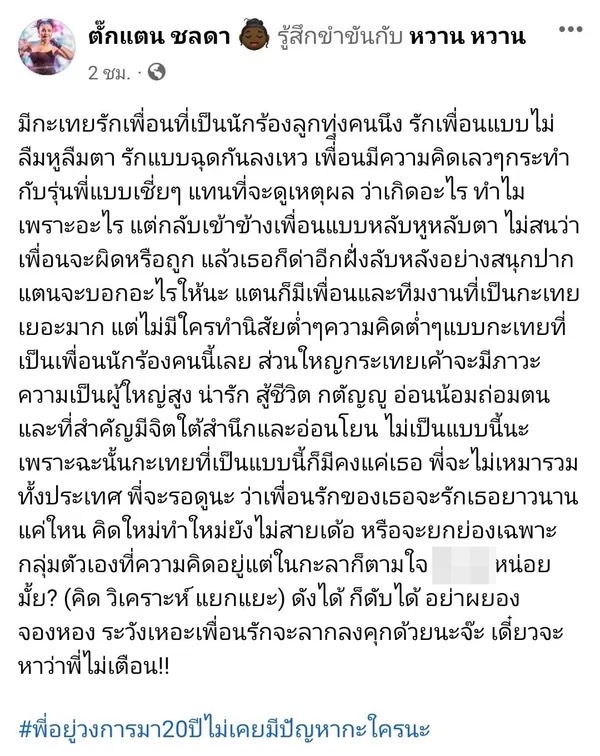 ทำเอานักร้องสาว “ตั๊กแตน ชลดา”เกิดอาการหัวร้อนออกมาฟาดดุเดือด หลังไปได้ยินเรื่องที่ไม่โอกับความรู้สึก ซึ่งเจ้าตัวออกมาโพสต์ข้อความสุดเร้าร้อนว่า “มีกะเทยรักเพื่อนที่เป็นนักร้องลูกทุ่งคนนึง รักเพื่อนแบบไม่ลืมหูลืมตา รักแบบฉุดกันลงเหว เพื่อนมีความคิดเลวๆ กระทำ กับรุ่นพี่แบบเแย่ๆ แทนที่จะดูเหตุผล ว่าเกิดอะไร ทำไม เพราะอะไร แต่กลับเข้าข้างเพื่อนแบบหลับหูหลับตา ไม่สนว่าเพื่อนจะผิดหรือถูก แล้วเธอก็ด่าอีกฝั่งลับหลังอย่างสนุกปาก