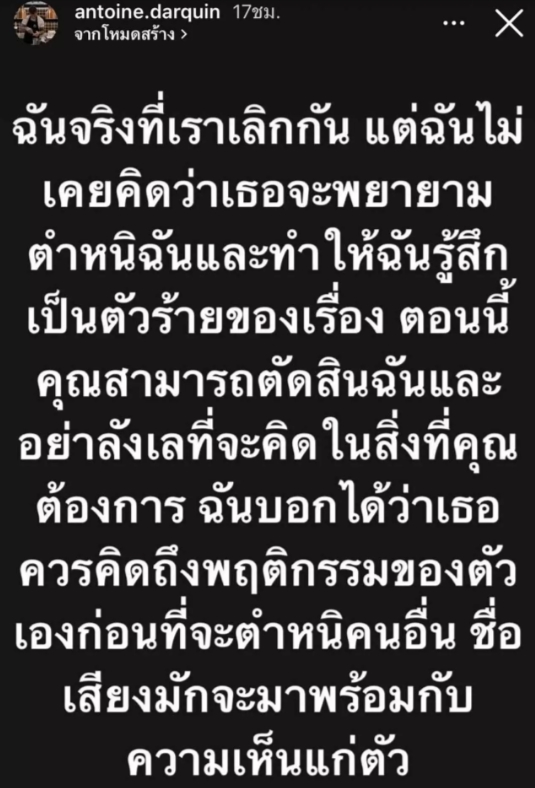 ขณะที่ฝ่ายชายก็ออกมาโพสต์ข้อความโต้เดือดซัดกลับ “มิ้วกี้” บอก “ฉันจริงที่เราเลิกกัน แต่ฉันไม่เคยคิดว่าเธอจะพยายามตำหนิฉันและทำให้ฉันรู้สึกเหมือนตัวร้ายของเรื่องนี้ ตอนนี้คุณสามารถตัดสินฉันและอย่าลังเลที่จะคิดในสิ่งที่คุณต้องการ ฉันบอกได้ว่าทุกคนคิดถึงพฤติกรรมของตัวเองก่อนที่จะตำหนิคนอื่น ชื่อเสียงมักจะมาพร้อมกับความเห็นแก่ตัว”