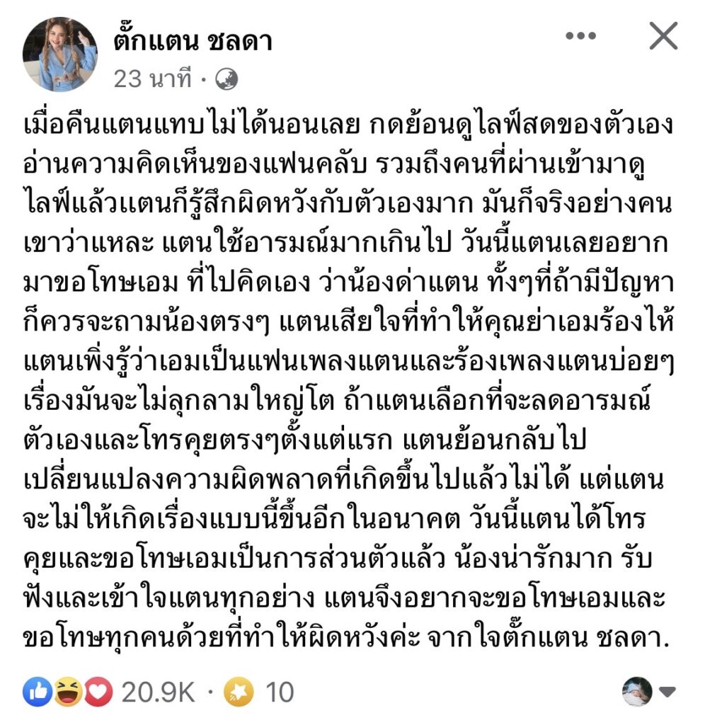วันนี้แตนเลยอยากมาขอโทษเอม ที่ไปคิดเอง ว่าน้องด่าแตน ทั้งๆที่ถ้ามีปัญหา ก็ควรจะถามน้องตรงๆ แตนเสียใจที่ทำให้คุณย่าเอมร้องไห้ แตนเพิ่งรู้ว่าเอมเป็นแฟนเพลงแตนและร้องเพลงแตนบ่อยๆ เรื่องมันจะไม่ลุกลามใหญ่โต ถ้าแตนเลือกที่จะลดอารมณ์ตัวเองและโทรคุยตรงๆตั้งแต่แรก แตนย้อนกลับไปเปลี่ยนแปลงความผิดพลาดที่เกิดขึ้นไปแล้วไม่ได้ แต่แตนจะไม่ให้เกิดเรื่องแบบนี้ขึ้นอีกในอนาคต วันนี้แตนได้โทรคุยและขอโทษเอมเป็นการส่วนตัวแล้ว น้องน่ารักมาก รับฟังและเข้าใจแตนทุกอย่าง แตนจึงอยากจะขอโทษเอมและขอโทษทุกคนด้วยที่ทำให้ผิดหวังค่ะ จากใจ ตั๊กแตน ชลดา”