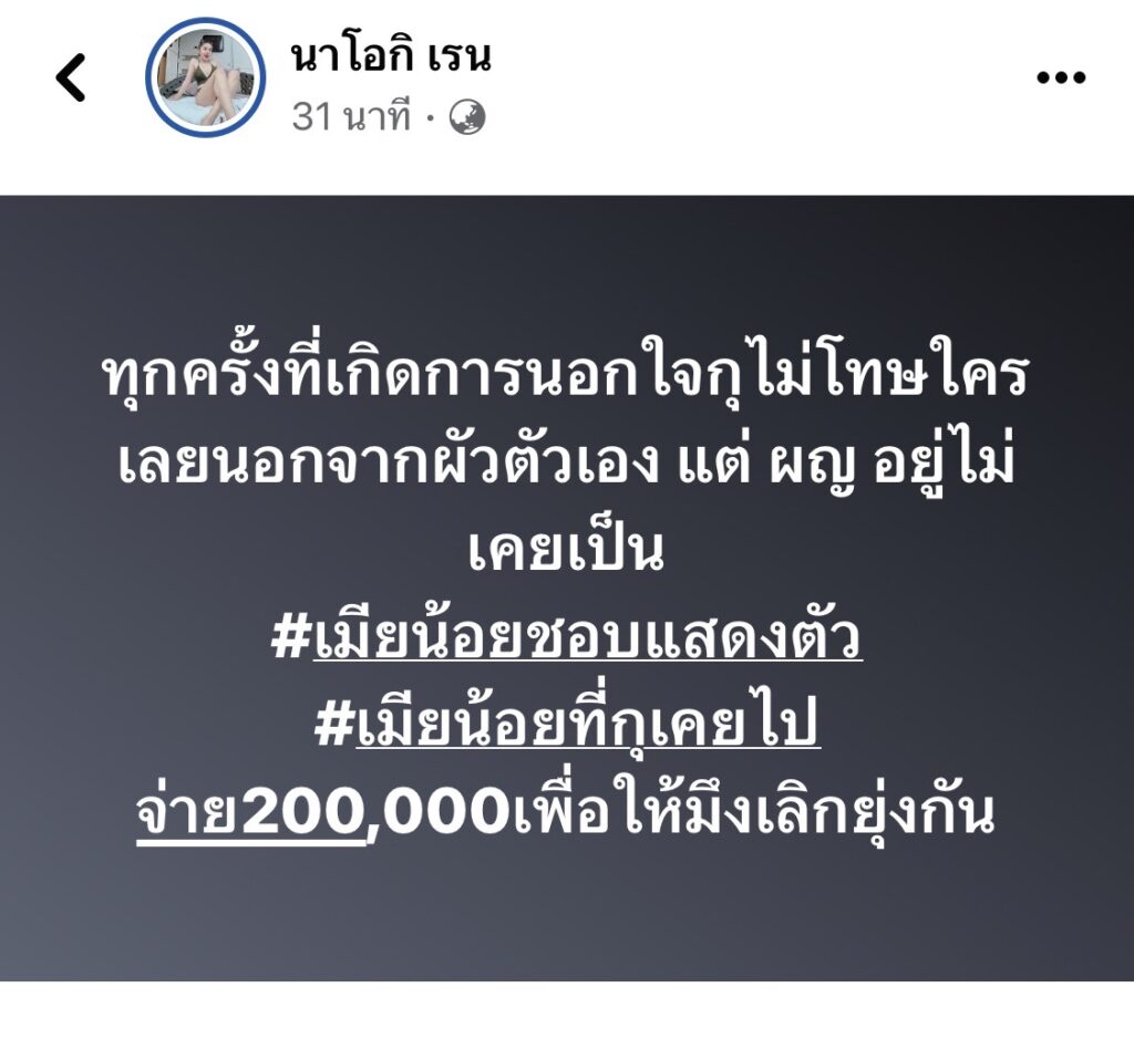 ล่าสุด นัส ได้ออกมาแฉ โชค รถแห่ ผ่านเฟซบุ๊กส่วนตัวอีกครั้ง บอกเคยจ่าย2 แสนให้เมียน้อยเลิกยุ่งกับผัวตนเอง โดยระบุข้อความว่า “ทุกครั้งที่เกิดการนอกใจ ไม่โทษใครเลยนอกจากผัวตัวเอง แต่ ผญ อยู่ไม่เคยเป็น เมียน้อยชอบแสดงตัว เมียน้อยที่เคยไปจ่าย200,000เพื่อให้มึ*เลิกยุ่งกัน”