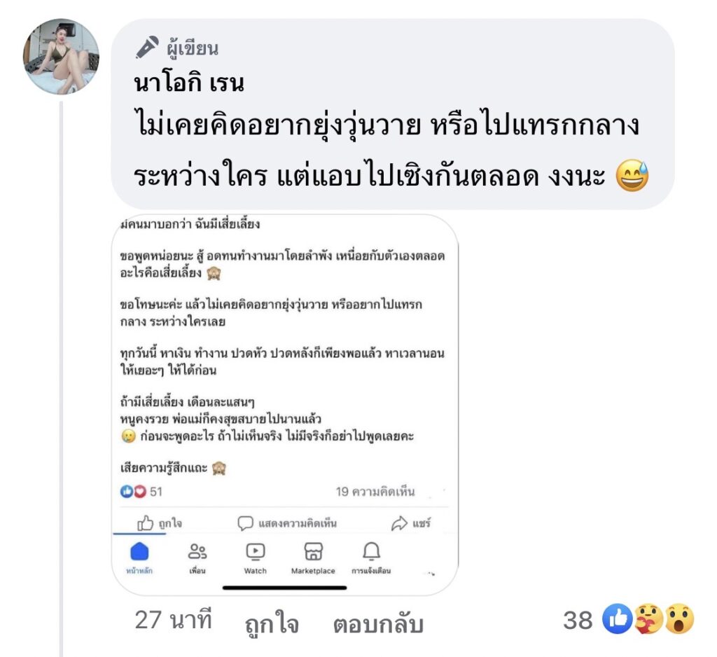 นอกจากนี้เจ้าตัวยังโพสต์ข้อความชี้แจงหลังมีคนกล่าวหาว่าเธอมีเสี่ยเลี้ยง ระบุว่า “ขอพูดหน่อยนะ สู้ อดทน ทำงานมาโดยลำพัง เหนื่อยกับตัวเองตลอด อะไรคือเสี่ยเลี้ยง ขอโทษนะค่ะ แล้วไม่เคยคิดอยากยุ่งวุ่นวาย หรืออยากไปแทรกกลางระหว่างใครเลย