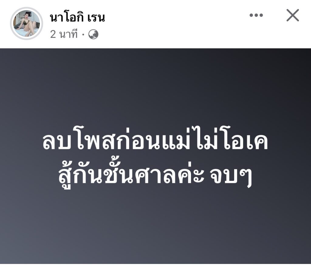 ซึ่งต่อมาเจ้าตัวก็ยังได้โพสต์ภาพข้อความอีกว่า “ลบโพสก่อนแม่ไม่โอเค สู้กันชั้นศาลค่ะ จบๆ”