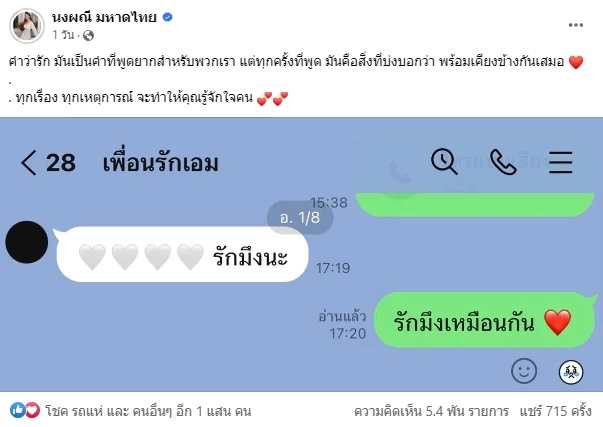 ซึ่งงานนี้ก็มีคนบันเทิงที่เข้าไปคอมเมนต์แสดงความคิดเห็นและส่งกำลังใจให้ทั้งสองฝ่าย เช่นเดียวกับ นักร้องหนุ่ม เพชร สหรัตน์ อดีตสามีของ ตั๊กแตน ชลดา ได้มีความเคลื่อนไหวด้วยการเข้าไปแสดงความคิดเห็น บนโพสต์ของ จ๊ะ นงผณี ที่แชทสนทนากับ “เอม วิทวัส” ระบุข้อความว่า “คำว่ารัก มันเป็นคำที่พูดยากสำหรับพวกเรา แต่ทุกครั้งที่พูด มันคือสิ่งที่บ่งบอกว่า พร้อมเคียงข้างกันเสมอ ทุกเรื่อง ทุกเหตุการณ์ จะทำให้คุณรู้จักใจคน” เเต่ที่ทำเอาชาวโซเชียลฮือฮาเมื่อ“เพชร สหรัตน์”เข้าไปคอมเมนต์ ส่งรูปอิโมชูสองนิ้วให้ด้วย