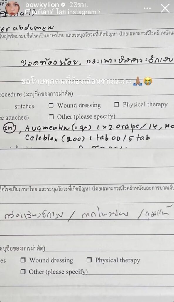 ล่าสุดทำเอาแฟนคลับแห่ส่งกำลังใจให้รัวๆ เมื่อสาวโบกี้มีอาการป่วยกระทันหัน โดยเป็นภาพตัวเองนั่งอยู่บนรถเข็น พร้อมเขียนว่า “GAME OVER” และเขียนข้อความว่า “เนื่องจากจอบอมีอาการป่วยกะทันหันและแพทย์มีความเห็นให้พักงานชั่วคราว เพื่อรักษาร่างกาย