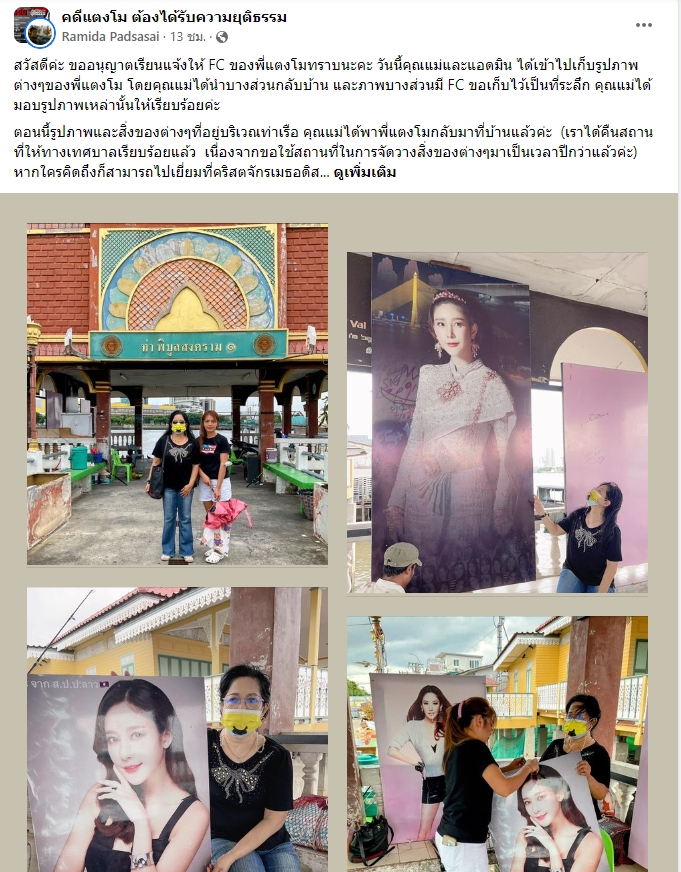 “สวัสดีค่ะ ขออนุญาตเรียนแจ้งให้ FC ของพี่แตงโมทราบนะคะ วันนี้คุณแม่และแอดมิน ได้เข้าไปเก็บรูปภาพต่างๆของพี่แตงโม โดยคุณแม่ได้นำบางส่วนกลับบ้าน และภาพบางส่วนมี FC ขอเก็บไว้เป็นที่ระลึก คุณแม่ได้มอบรูปภาพเหล่านั้นให้เรียบร้อยค่ะ