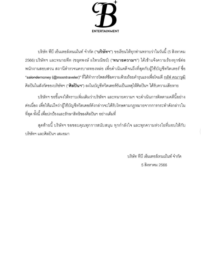 “บริษัท ทีบี เอ็นเตอร์เทนเม้นท์ จำกัด ขอเรียนให้ทุกท่านทราบว่าในวันนี้ 5 สิงหาคม 2566 บริษัทและทนายพีท ชยุตพงษ์ ผไทวณิชย์ ได้เข้าแจ้งความร้องทุกข์ต่อพนักงานสอบสวน สถานีตำรวจนครบาลทองหล่อ เพื่อดำเนินคดีจนถึงที่สุดกับผู้ใช้บัญชีทวิตเตอร์ ชื่อ ………………ที่ได้ทำการโพสต์ข้อความด้วยถ้อยคำรุนแรงเพื่อโจมตี กลัฟ คณาวุฒิ ศิลปินในสังกัดของบริษัทฯ ลงในบัญชีทวิตเตอร์อันเป็นเหตุให้ศิลปินฯ ได้รับความเสียหาย