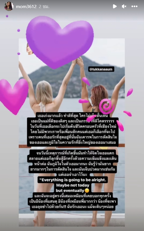 ส่วนทางด้าน แม่ของอุ้ม ลักขณา ก็ได้แชร์โพสต์ของลูกสาว ลงบนสตอรี่อินสตราแกรมส่วนตัว พร้อมระบุแคปชั่นว่า “เข้มแข็งนะลูก ถึงมันจะเจ็บมาก ๆ เดี๋ยวมันก็ผ่านไป เธอมีคุณค่า เธอต้องเปล่งประกาย #ฟ้าหลังฝนสวยงามเสมอ”