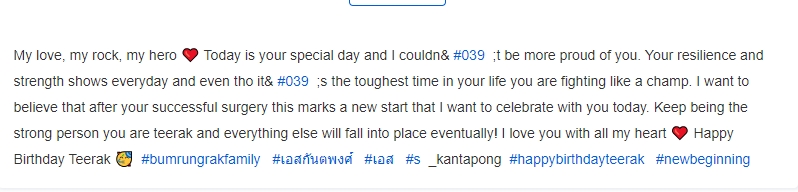 ” ที่รัก ที่พึ่งของฉัน ฮีโร่ของฉัน วันนี้เป็นวันพิเศษของคุณ และ ฉันภูมิใจในตัวคุณมาก จนไม่อาจจะภูมิใจในตัวคุณได้มากไปกว่านี้แล้ว คุณแสดงความแข็งแกร่งและความสามารถในการฟื้นตัวให้เห็นในทุกๆวัน และแม้ว่ามันจะเป็นช่วงเวลาที่ยากที่สุดในชีวิตของคุณ คุณก็กำลังต่อสู้อย่างผู้ชนะ ฉันเชื่อว่าหลังจากการผ่าตัดของคุณที่ประสบความสำเร็จ นี่เป็นการเริ่มต้นใหม่ที่ฉันอยากจะฉลองร่วมกับคุณในวันนี้ จงเป็นคนที่เข้มแข็งต่อไป แล้วทุกอย่างก็จะเข้าที่เข้าทางในที่สุด! รักเธอสุดหัวใจ สุขสันต์วันเกิด ที่รัก ”