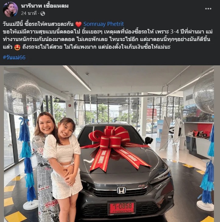 ปิดท้ายกันที่นักร้องลูกทุ่งสาว”ลิลลี่ นารีนาท หรือ ลิลลี่ ได้หมดถ้าสดชื่น”ที่วันแม่ปีนี้เจ้าตัวเปย์คุณแม่หนักด้วยการซื้อรถคันใหม่ป้ายแดงให้ โดยการโพสต์ภาพพร้อมแคปชั่นว่า “วันแม่ปีนี้ ซื้อรถให้คนสวยละกัน Somruay Phetrit ขอให้แม่มีความสุขแบบนี้ตลอดไป ยิ้มเยอะๆ เหตุผลที่น้องซื้อรถให้ เพราะ 3-4 ปีที่ผ่านมา แม่ทำงานหนักร่วมกับน้องมาตลอด ไม่เคยพักเลย ไหนจะไข้อีก แต่มาตอนนี้ทุกๆอย่างมันก็ดีขึ้นแล้ว ถึงรถจะไม่ได้สวย ไม่ได้แพงมาก แต่น้องตั้งใจเก็บเงินซื้อให้แม่นะ #วันแม่66”
