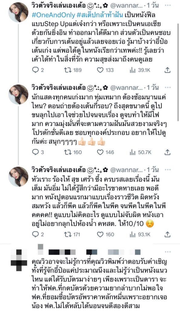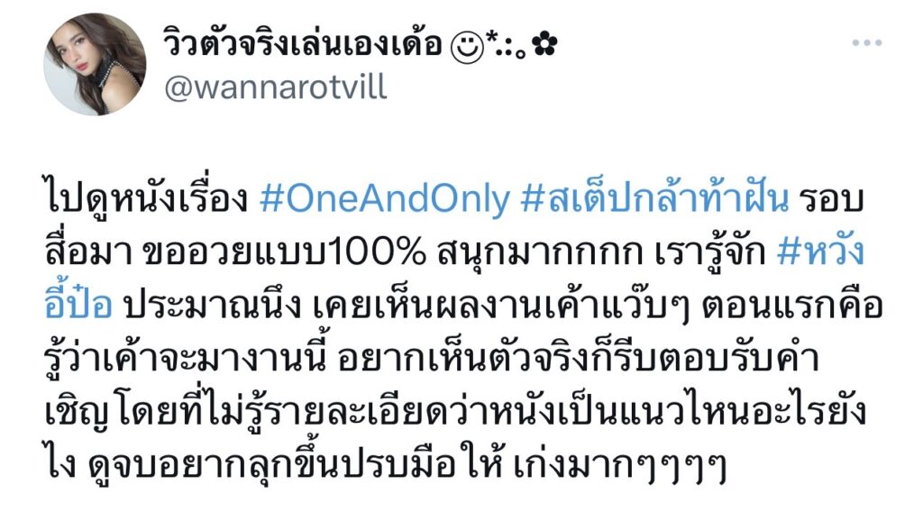 จู่ๆก็งานเข้าทัวร์ลงซะงั้น สำหรับนักแสดงสาวสวย”วิว วรรณรท” หลังจากตัวได้ออกมาทวิตรีวิวภาพยนตร์เรื่อง “สเต็ปกล้า…ท้าฝัน One and Only ที่ได้ไปดูรอบสื่อมา โดยนักแสดงนำคือ”หวังอี้ป๋อ”ซึ่งเจ้าตัวทวิตว่าไปดูหนังเรื่อง #OneAndOnly #สเต็ปกล้าท้าฝัน รอบสื่อมา ขออวยแบบ100% สนุกมากกกก เรารู้จัก #หวังอี้ป๋อ ประมาณนึง เคยเห็นผลงานเค้าแว๊บๆ ตอนแรกคือรู้ว่าเค้าจะมางานนี้ อยากเห็นตัวจริงก็รีบตอบรับคำเชิญโดยที่ไม่รู้รายละเอียดว่าหนังเป็นแนวไหนอะไรยังไง ดูจบอยากลุกขึ้นปรบมือให้ เก่งมากๆๆๆๆ