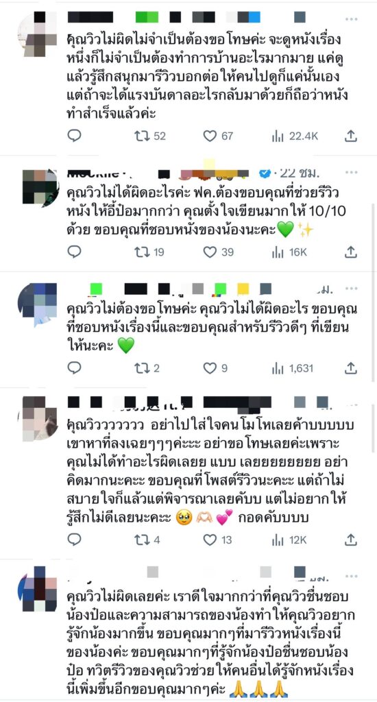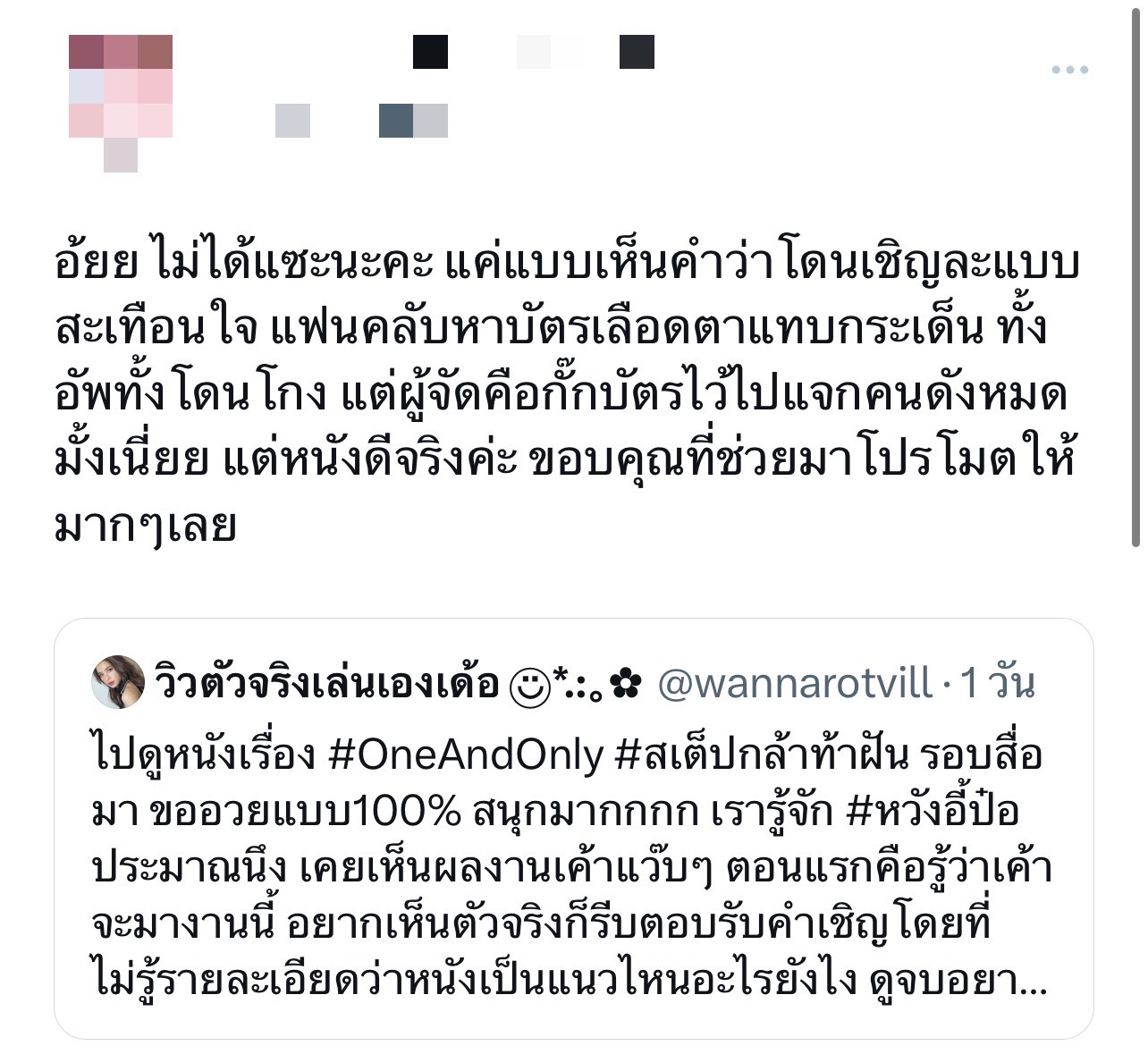 หลังจากโพสต์ดังกล่าวถูกเผยแพร่ออกไป ก็มีชาวเน็ตบางคนเข้ามาคอมเมนต์ทำนองว่า คุณวิวอาจจะไม่รู้การที่คุณวิวพิมพ์ว่าตอบรับคำเชิญทั้งที่รู้จักอี้ป๋อแค่ประมาณนึงและไม่รู้ว่าเป็นหนังแนวไหน แต่ได้รับบัตรมาง่ายๆ เพียงเพราะเป็นดารา จะทำให้ฟค.ที่กดบัตรด้วยความยากลำบากไม่พอใจ ฟค.ที่ยอมซื้อบัตรอัพราคาหลักหมื่นเพราะอยากเจอน้อง ฟค.ไม่ได้หลับได้นอนจนตีสองตีสาม บางคนก็บอกว่า”ไม่ได้แซะนะคะ แค่แบบเห็นคำว่าโดนเชิญละแบบสะเทือนใจ แฟนคลับหาบัตรเลือดตาแทบกระเด็น ทั้งอัพทั้งโดนโกง แต่ผู้จัดคือกั๊กบัตรไว้ไปแจกคนดังหมดมั้งเนี่ยย