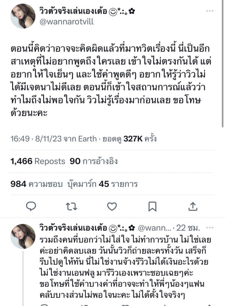 ล่าสุดทางด้านสาว”วิว”ได้ออกมาทวิตขอโทษปมดังกล่าวว่า “ตอนนี้คิดว่าอาจจะคิดผิดแล้วที่มาทวิตเรื่องนี้ นี่เป็นอีกสาเหตุที่ไม่อยากพูดถึงใครเลย เข้าใจไม่ตรงกันได้ แต่อยากให้ใจเย็นๆ และใช้คำพูดดีๆ อยากให้รู้ว่าวิวไม่ได้มีเจตนาไม่ดีเลย ตอนนี้ก็เข้าใจสถานการณ์แล้วว่าทำไมถึงไม่พอใจกัน วิวไม่รู้เรื่องมาก่อนเลย ขอโทษด้วยนะคะ”