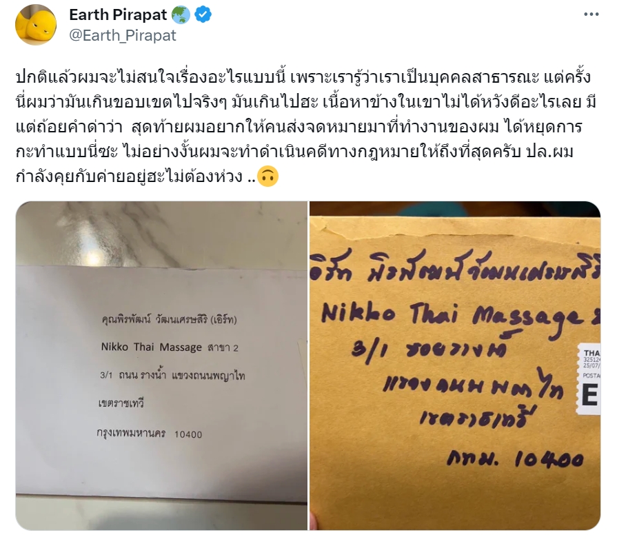 เป็นคนในวงการบันเทิงอีกคนที่เจอผู้ไม่หวังดีคุกคามรุกล้ำพื้นที่ส่วนตัวอย่างหนัก สำหรับนักแสดง หนุ่ม “เอิร์ท พิรพัฒน์” หลังเจอบุคคลปริศนาส่งจดหมายมาถึงร้านนวดที่เป็นธุรกิจของตนเอง เมื่อเปิดดูข้อความมีแต่คำด่าทอ เจ้าตัวจึงไม่ทนได้โพสต์รุปซองจดหมายที่ส่งมา พร้อมเตือนสติคนที่ส่งมาหยุดการกระทำแบบนี้ ไม่เช่นนั้นจะทำการดำเนินคดีตามกฎหมายแน่นอน โดยระบุข้อความว่า