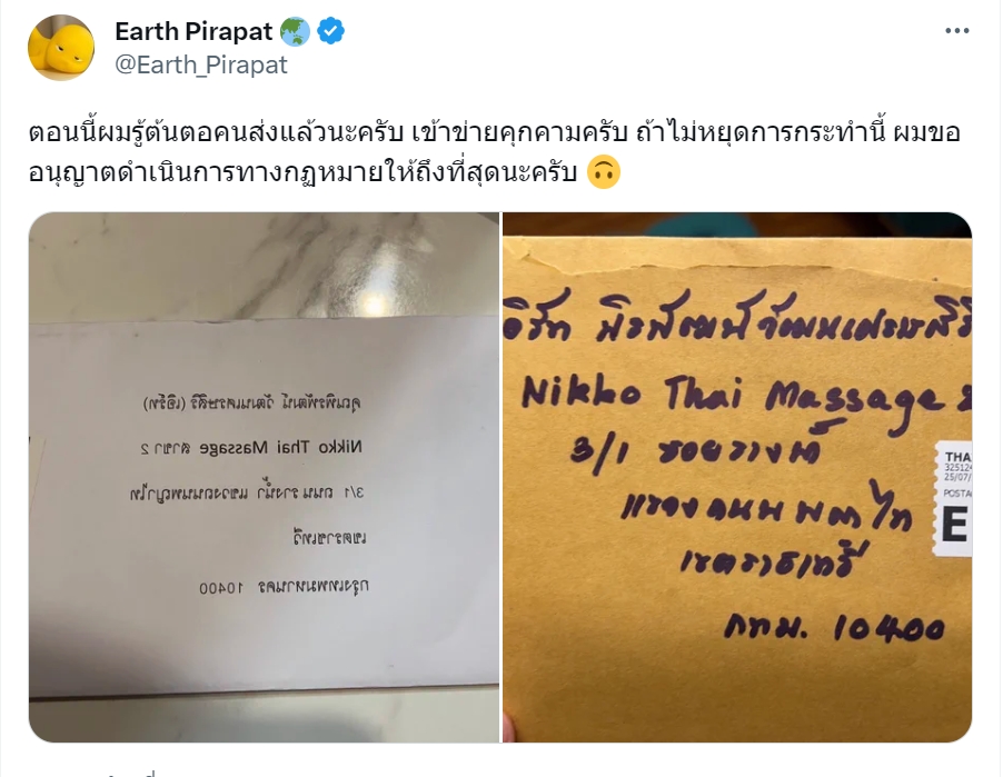 “ตอนนี้ผมรู้ต้นตอคนส่งแล้วนะครับ เข้าข่ายคุกคามครับ ถ้าไม่หยุดการกระทำนี้ผมขออนุญาตดำเนินการทางกฎหมายให้ถึงที่ สุดนะครับ โพสต์หน้าผมจะโพสต์ข้อความข้างในซองจดหมายด้วยนะครับ 🙂 ถ้ายังไม่หยุดอีก