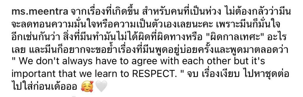 ล่าสุดเจ้าตัวออกมาโพสต์อีกครั้งว่า “จากเรื่องที่เกิดขึ้น สำหรับคนที่เป็นห่วง ไม่ต้องกลัวว่ามีนจะลดทอนความมั่นใจหรือความเป็นตัวเองเลยนะคะ เพราะมีนก็มั่นใจอีกเช่นกันว่า สิ่งที่มีนทำมันไม่ได้ผิดที่ผิดทางหรือ “ผิดกาลเทศะ” อะไรเลย และมีนก็อยากจะขอย้ำเรื่องที่มีนพูดอยู่บ่อยครั้งและพูดมาตลอดว่า ” We don’t always have to agree with each other but it’s important that we learn to RESPECT. “จบ เรื่องเงียบ ไปหาชุดต่อไปใส่ก่อนเด้อออ”