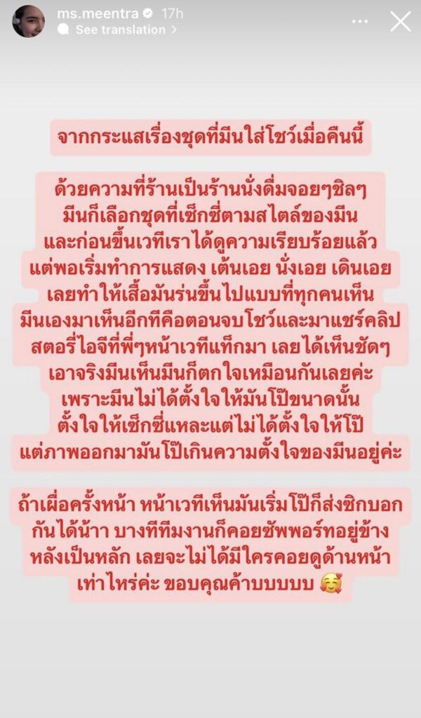 ต่อมาทางด้านสาว”มีนตรา“ ได้ออกมาชี้แจงว่า “จากกระแสเรื่องชุดที่มีนใส่โชว์เมื่อคืนนี้ ด้วยความที่ร้านเป็นร้านนั่งดื่มจอยๆ ชิลๆ มีนก็เลือกชุดที่เซ็กซี่ตามสไตล์ของมีน และก่อนขึ้นเวทีเราได้ดูความเรียบร้อยแล้ว แต่พอเริ่มทำการแสดง เต้นเอย นั่งเอย เดินเอย เลยทำให้เสื้อมันร่นขึ้นไปแบบที่ทุกคนเห็นมีนเองมาเห็นอีกทีคือตอนจบโชว์และมาแชร์คลิปสตอรี่ไอจีที่พี่ๆ หน้าเวทีแท็กมา เลยได้เห็นชัดๆ เอาจริง มีนเห็นมีนก็ตกใจเหมือนกันเลยค่ะ เพราะมีนไม่ได้ตั้งใจให้มันโป๊ขนาดนั้น ตั้งใจให้เซ็กซี่แหละ แต่ไม่ได้ตั้งใจให้โป๊แต่ภาพออกมามันโป๊เกินความตั้งใจของมีนอยู่ค่ะ ถ้าเผื่อครั้งหน้า หน้าเวทีเห็นมันเริ่มโป๊ก็ส่งซิกบอกกันได้น้า บางทีทีมงานก็คอยซัพพอร์ตอยู่ข้างหลังเป็นหลัก เลยจะไม่ได้มีใครคอยดูด้านหน้าเท่าไรค่ะ ขอบคุณค้าบบบบบ”